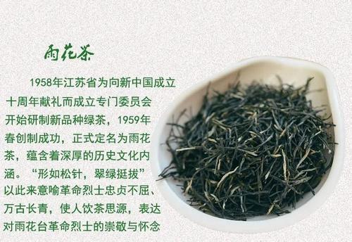 南京雨花茶是綠茶炒青中的珍品,也是中國(guó)三針之一,即:安化松針(半烘半炒),南京雨花(炒青),恩施玉露(蒸青),是優(yōu)質(zhì)細(xì)嫩針狀春茶,產(chǎn)于南京中山陵,雨花臺(tái)園林風(fēng)景區(qū),因此得名“雨花茶”。 雨花茶創(chuàng)制于1958年,是60年底代我國(guó)綠茶中嶄露頭角的新品名茶。