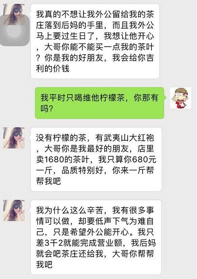 這個時候,騙子十有八九會出現(xiàn)跟你說失戀的情況,哭的傷心欲絕,然后跟你傾訴,讓你憐香惜玉,之后會跑到武夷山爺爺奶奶或者外公外婆家中療傷,幫忙種茶炒茶,學會炒茶葉后決定自立自強,開創(chuàng)自己的事業(yè) —— 炒茶葉,賣茶葉。