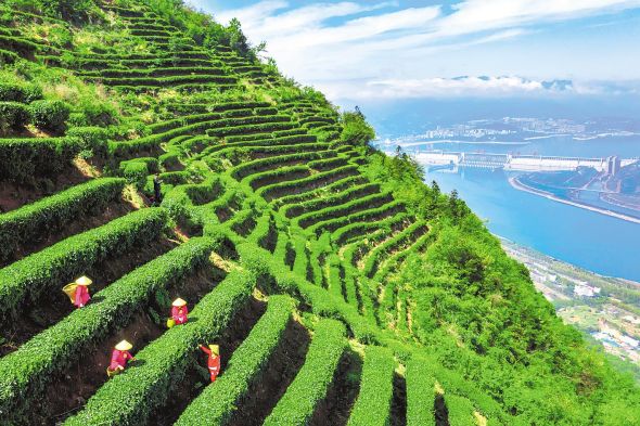 宜昌市夷陵區(qū)三斗坪鎮(zhèn)黃牛巖農(nóng)民利用梯田建設(shè)青云頂茶山小鎮(zhèn),發(fā)展農(nóng)旅融合產(chǎn)業(yè),讓游客體驗茶文化、觀賞大壩勝景。(湖北日報全媒記者 陳勇 攝)