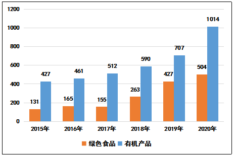 圖10  2015-2020綠色食品及有機產(chǎn)品數(shù)和組織數(shù)比較圖