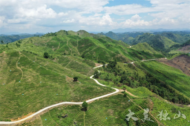 產業(yè)路下方,20來名群眾正在躬身勞作,下苗、覆土,一株株茶苗便種植完成。剛種下的低矮茶苗,與產業(yè)路上方郁郁蔥蔥的茶山形成強烈反差。
