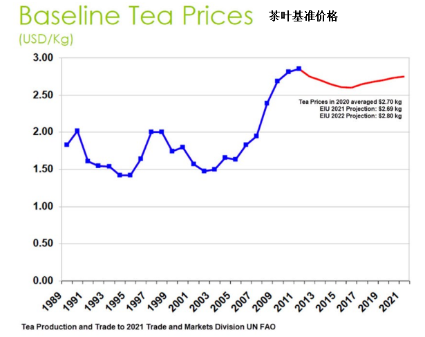 經(jīng)濟(jì)學(xué)人智庫(EIU)估計(jì)茶葉價(jià)格將上漲至接近長期平均水平,“我們預(yù)計(jì),因?yàn)楣┎粦?yīng)求,加上一些市場(特別是歐洲和北美)的茶葉需求逐漸復(fù)蘇,2021年剩余時(shí)間茶葉價(jià)格會(huì)穩(wěn)中有升。我們估計(jì)2021年全年平均價(jià)格為2.69美元/公斤,比 2020 年下降 0.5%。2022年茶葉均價(jià)將上漲 8.7%,至2.92 美元/公斤。”